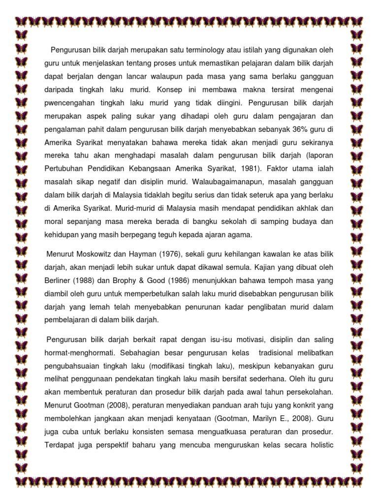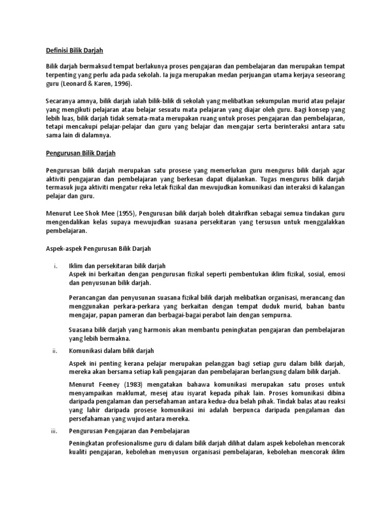 13 pengurusan bilik darjah satu proses yang melibatkan penyusunan fizikal sesebuah bilik darjah serta galakan komunikasi dan interaksi antara murid tempoh komprehensif pelbagai tindakan guru untuk memudahkan proses pengajaran dan pembelajaran di dalam kelas. Manakala, pendapat levin dan nolan (2004) pula, mereka memberi tumpuan aspek keberkesanan dalam pengurusan bilik darjah itu sendiri. Menekankan pendekatan pengajaran berpusatkan murid. Pelan perancangan pengurusan bilik darjah mempunyai tiga langkah iaitu rancang, susundan praktis. Pengurusan yang efektif dalam bilik darjah haruslah bersifat proaktif, responsif dan menyokong. · levin dan nolan (2004) Pengurusan yang efektif dalam bilik darjah haruslah bersifat proaktif, responsif dan menyokong. Menurut haji samsudin bin md noor, pengurusan bermaksud satu proses mendapatkan penyertaan, kerjasama, dan campurtangan ahli untuk mencapai objektif organisasi atau kumpulan, gerak kerjanya termasuk proses merancang, mengelola, memimpin, mengarah dan mengawal. Pengurusan bilik darjah melibatkan aspek memotivasikan pelajar untuk belajar, menyediakan arahan dan maklumat yang bersesuaian dan menguruskan kerja murid. Aktiviti pengurusan harian bilik darjah. Kecekapan pengurusan bilik darjah seseorang guru berkait rapat dengan kemahiran mengawal juga termasuk dalam ilmu pengurusan bilik darjah. Jika seseorang guru berjaya mengurus bilik darjah dengan sempurna, maka proses pengajaran dan pembelajaran (pdp) boleh ditafsirkan sebagai berjaya. Ramai yang mengatakan pengurusan bilik darjah merupakan aspek yang paling sukar.
