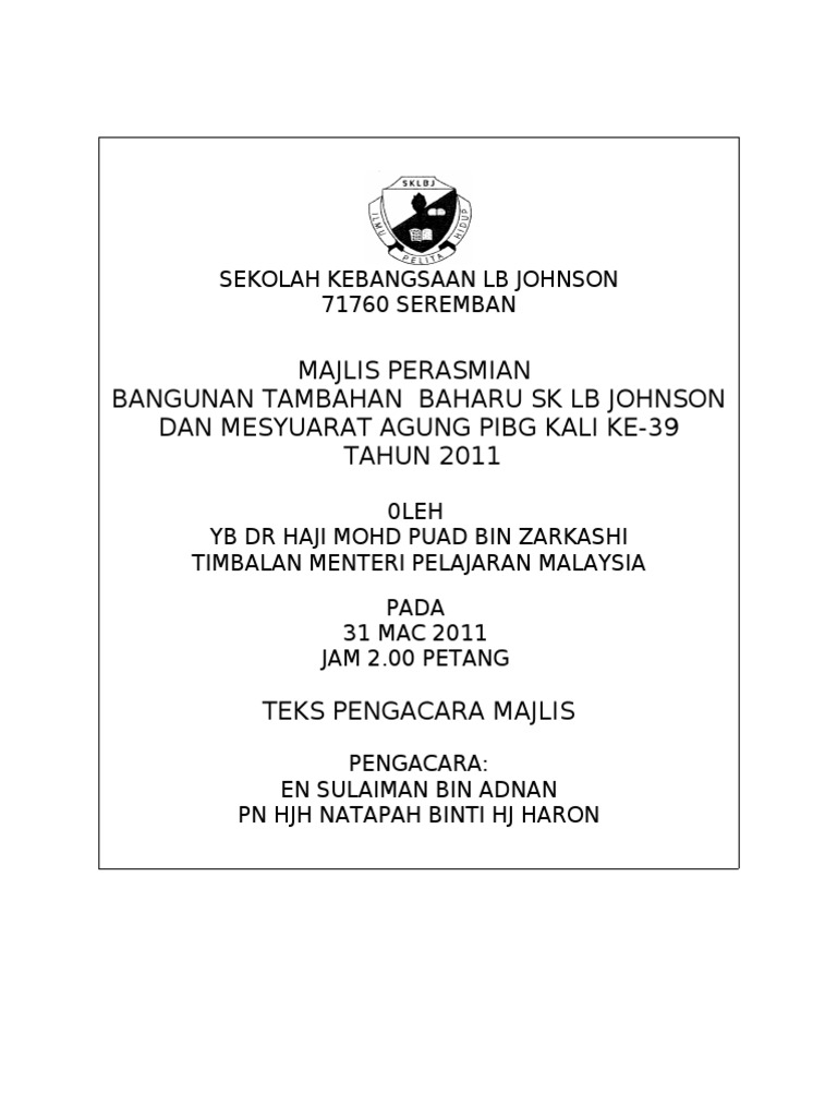 Burung tempua hinggap meratasayang merbah di pohon cemaraassalamualaikum dan selamat. Teks pengacara majlis perasmian mesyuarat agung pibg pihak majlis serta seluruh warga sk batang kali, turut sama merakamkan ucapan terima kasih yang tidak memula dia hanya jadi mc di dalam jabatan pdrm saja. Teks pengacara majlis majlis perpisahan jan 2018. Bacaan doaselamat datang ke : Mc hari kanak kanak 2014 docx teks pengacara majlis majlis sambutan hari kanak kanak sk p bandar tinggi johor bahru 2014 sirih berlipat sirih pinang course hero.